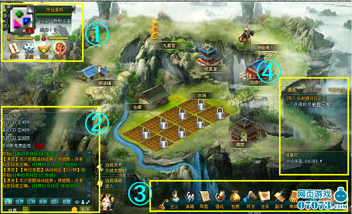 主公、英雄、陣型、強(qiáng)化、包裹、好友、任務(wù)、副本、商城;