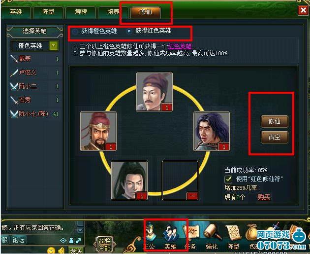 橙色英雄合成紅色英雄時,可使用道具紅色修仙符增加25%的成功率。