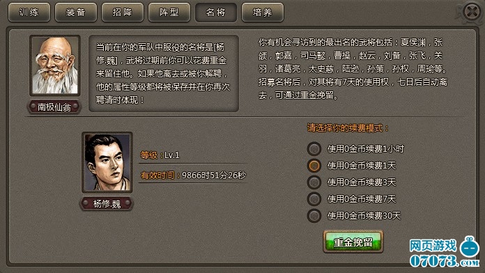 注意事項:名將招募之后,玩家仍需要手動進(jìn)行續(xù)費,續(xù)費消耗0金幣。請大家及時進(jìn)行續(xù)費操作,以免名將過期離開。