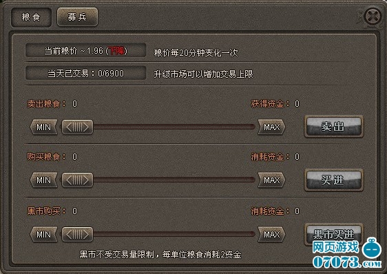 若玩家當(dāng)天交易額已滿,可通過黑市購買糧食,黑市交易不受最大交易額限制,玩家可以在任意時間以2的價格購買糧食。