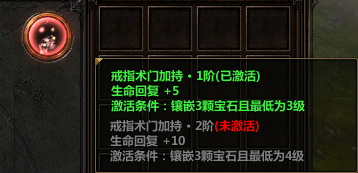 10級之后,開啟寶石功能,每件裝備都有一個(gè)術(shù)門可以鑲嵌寶石,每個(gè)術(shù)門可以鑲嵌3顆寶石。寶石可以合成。當(dāng)某一個(gè)術(shù)門的三個(gè)寶石孔槽全部鑲嵌了寶石,且最低等級的寶石為3級的時(shí)候,會激活術(shù)門加持的屬性,術(shù)門加持的等階越高,加持的數(shù)值就越高。并且隨著寶石的等級的提升,術(shù)門加持的屬性也會不斷提高!