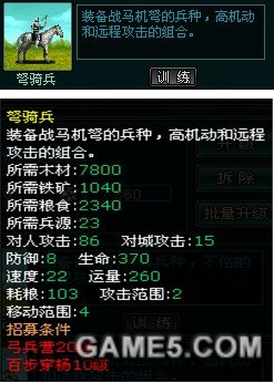 弩騎兵:高攻擊力、移動(dòng)力、生命力的兵種,優(yōu)點(diǎn)是攻高跑得快,非常適合打游擊戰(zhàn)。缺點(diǎn)是防御力偏低,造價(jià)昂貴,被大片割倒的話會(huì)非常凄慘。絕不能給對(duì)手近身肉搏的機(jī)會(huì)。建議在游戲中后期適當(dāng)量產(chǎn),突襲敵后、牽制黑騎部隊(duì)均有不錯(cuò)的效果。