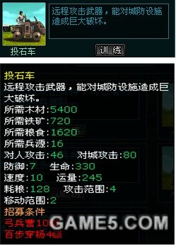 投石車:對(duì)建筑物有特效的弓兵器械。造價(jià)很高,摧城拔寨的利器,由于其對(duì)兵作戰(zhàn)能力并不強(qiáng),且防御不高,所以適合安排在主力陣容之后,主要用于摧毀敵城防御設(shè)施。