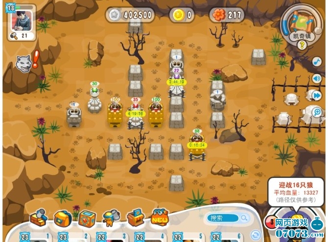 2.左邊30級(jí)毒鑲嵌塔往上平移了一格 增加了狼橫向多走2格的距離,如此也提高了主火力區(qū)的攻擊時(shí)間和攻擊效率