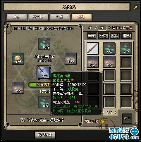 在某些時間段進(jìn)行煉化,能產(chǎn)生雙倍的煉化經(jīng)驗,要好好把握這個時間段。當(dāng)然如果元寶比較多,可以直接點(diǎn)擊消耗元寶進(jìn)行翻倍,在翻倍時間段進(jìn)行元寶翻倍,能獲得4倍的經(jīng)驗。