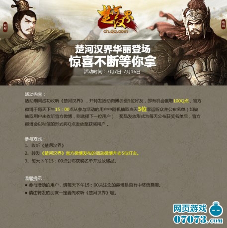 7月7日-7月16日,凡收聽楚河漢界微博,即有機(jī)會(huì)贏取100 Q點(diǎn),每天下午15:00時(shí)公布當(dāng)日獲獎(jiǎng)名單(隨機(jī)抽取獲獎(jiǎng)用戶,如被抽取用戶未收聽官方微博,則選擇下一位用戶),還在等什么,快快轉(zhuǎn)發(fā)起來吧~