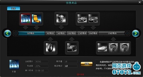 2)紅箭頭2:點(diǎn)擊“銷售”進(jìn)入產(chǎn)品列表頁面圖SD-004后,選擇商店等級相對應(yīng)的物品進(jìn)行銷售,然后在空閑處會出現(xiàn)銷售物品所需時(shí)間的倒計(jì)時(shí)。
