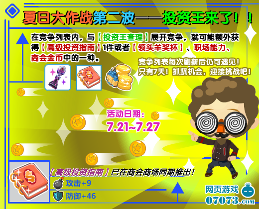 夏日大作戰(zhàn)第二波--投資王來了活動(dòng)已經(jīng)開啟,大家將會(huì)在7月21日至7月27日的商會(huì)競爭中遇到【投資王查理】。只要在商會(huì)競爭中戰(zhàn)勝他就有機(jī)會(huì)獲得【高級(jí)投資指南】一本或者【領(lǐng)頭羊獎(jiǎng)杯】、職場能力、商會(huì)金幣中的一種!