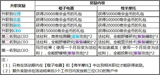 超級職場開啟新一期的指日高升活動,為了慶祝兩個公司的開放,全新的一級公司【橙子電器】和二級公司【綿羊摩托】,活動為期一個月,在活動期間內(nèi),在新公司中達(dá)到一定職位,就會獲得一定的獎勵。具體的活動規(guī)則如下:
