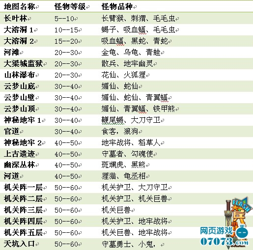 《大兵小將》中,不同種類不同等級(jí)的怪物分布于各個(gè)地圖中,玩家可參照上圖所示的怪物分布圖,找尋你心儀的寵物。