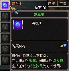 強(qiáng)化裝備需要強(qiáng)化石道具“滴翠玉”(強(qiáng)化40級(jí)以下裝備)或“星辰玉”(強(qiáng)化40級(jí)以上裝備),這兩種強(qiáng)化道具可以從道具商城中購(gòu)買(mǎi)獲得