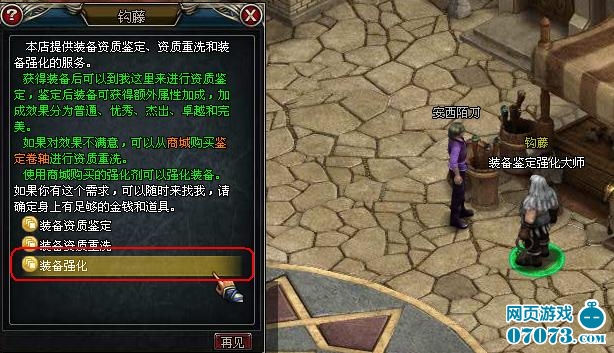 與NPC裝備鑒定強(qiáng)化大師(太陽(yáng)城鉤藤,珊瑚城烏歐塔,蠻爪王城納蘭沙民)進(jìn)行對(duì)話,選擇“裝備強(qiáng)化”