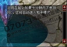 從個(gè)人混戰(zhàn),組隊(duì)混戰(zhàn),幫派混戰(zhàn)模式切換到和平模式時(shí),點(diǎn)擊對(duì)話框中的確定后,不會(huì)立即切換到和平模式,而是需要在之后的10分鐘內(nèi)不參與任何PK才能切換到和平模式。