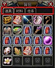 玩家的背包分為3部分,一般道具或者裝備會(huì)放入道具包中,玩家打怪打到的或者使用采集技能采集到的材料會(huì)放入材料包,而玩家做任務(wù)需要的任務(wù)物品會(huì)放入任務(wù)包。