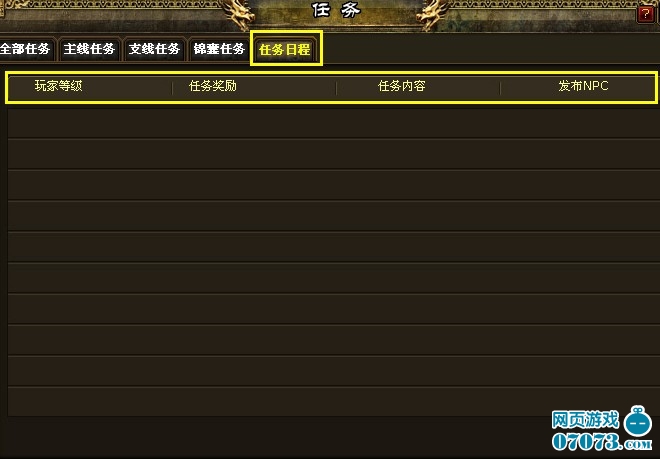 其它的幾個界面模式一樣,只是顯示任務類型的不同。“主線任務”界面顯示的是主要的劇情任務,“支線任務”界面顯示的是一些支線類任務,“錦囊任務”界面顯示的是關于新手引導的任務。