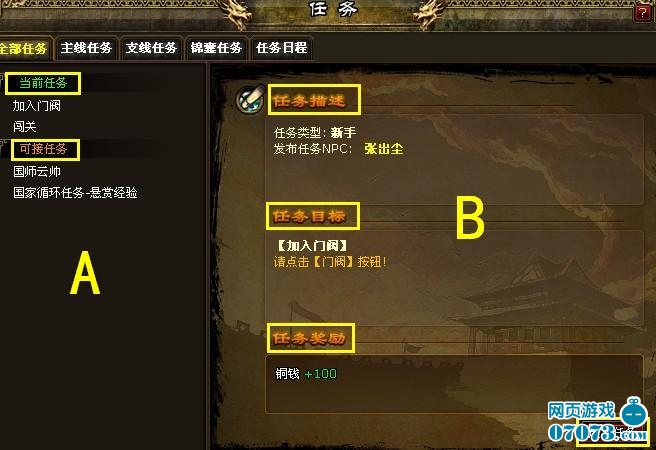 A區(qū)域表示當前玩家們已經接受到的任務名稱和玩家當前等級可以接受但還未接受的任務名稱;B區(qū)域分別表示任務目標、任務描述、任務獎勵,以及“放棄任務”選項。
