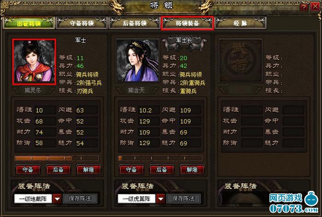 通過(guò)游戲界面下方菜單欄的“將領(lǐng)”按鈕,進(jìn)入【將領(lǐng)】界面,可以看到將領(lǐng)信息,點(diǎn)擊將領(lǐng)的頭像,或者選擇“將領(lǐng)裝備”選項(xiàng),就可以進(jìn)入將領(lǐng)【裝備】的界面。
