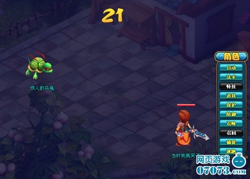 馬上就進(jìn)入了第一次戰(zhàn)斗,沒加入門派的你還不會(huì)使用技能哦,左鍵點(diǎn)擊烏龜,用普通攻擊打倒它: