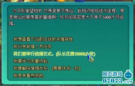 進(jìn)行結(jié)婚操作時(shí),隊(duì)長(zhǎng)需花費(fèi)50000金錢(qián);