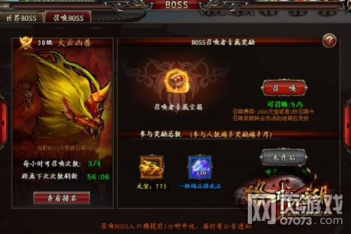 1、玩家每天最多可召喚5次BOSS,每次花費500元寶或1枚召喚令可召喚BOSS。成功召喚后可獲得召喚BOSS專屬寶箱,內(nèi)含50個飾品強化石、40級金色飾品。