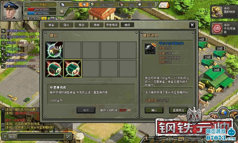 為了讓大家體驗(yàn)到更多繳獲樂趣,《鋼鐵元帥》創(chuàng)新設(shè)計(jì)出基地繳獲的玩法,玩家只要把軍事基地提升到指定等級(jí),即可開啟商店內(nèi)“繳獲”的功能。不需要承擔(dān)任何的損失,只要進(jìn)入基地建筑“商店”,通過特設(shè)的繳獲功能,直闖敵方軍火庫和丹藥庫,展開各種“淘寶”行動(dòng)。玩家每一次繳獲都不會(huì)空手而歸,綠色裝備是最基本的斬獲,一旦你的人品適時(shí)爆發(fā),那么藍(lán)色、紫色甚至黃色裝備也是不在話下,相信基地繳獲玩法一定能帶給你超乎相信的驚喜!