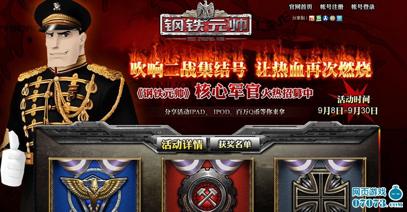 人人游戲2011年傾情巨制,策略頁游巔峰之作《鋼鐵元帥》“核心軍官”全球火熱招募中……二戰(zhàn)的集結(jié)號已經(jīng)響起,帝國的戰(zhàn)士們,快來領(lǐng)取你的“軍官證”,一起喊出心中的熱血宣言吧,更有機(jī)會贏得IPAD、IPOD、Q幣等驚喜大禮喲!