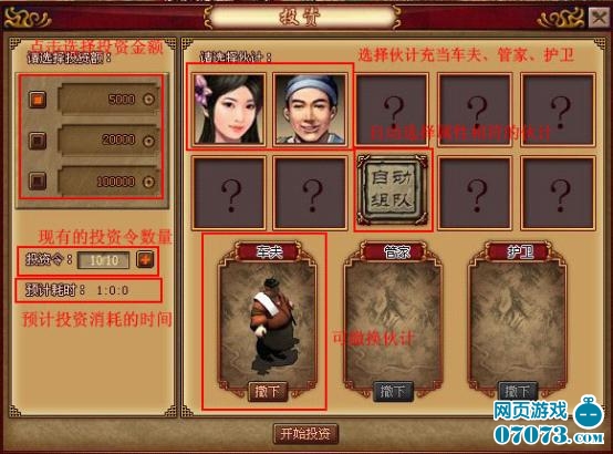為了增加投資爭奪戰(zhàn)的趣味,每發(fā)生1次投資行為需消耗1個投資令,1次投資過程中,最多可以有3次挑戰(zhàn)機會。擔(dān)任“護衛(wèi)”的伙計會進行參戰(zhàn),所以伙計的養(yǎng)成也是非常重要的。勝利方:伙計減少移動時間30S,失敗方:伙計增加移動時間30S。