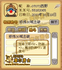 修煉30域擊破稱號(hào)屬性:生命上限+50,防御+3,魔法防御+3,速度+2!絕對(duì)最強(qiáng)的稱號(hào)屬性。〉谝粋(gè)加魔法防御的稱號(hào)!第一個(gè)加速度的稱號(hào)!生命+雙方+速度,攻守提示都好大的說(shuō)!