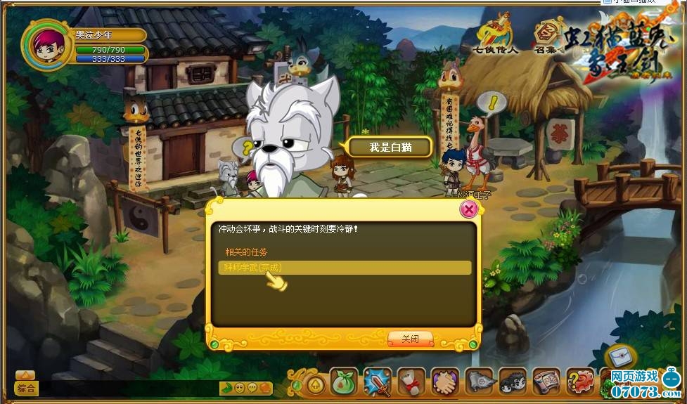 一.點(diǎn)擊沙漠王子選擇拜師任務(wù),根據(jù)任務(wù)要求找到白貓伯伯,在白貓伯伯的指引下,可選擇何人為師!我們首先選擇拜虹貓為師,學(xué)習(xí)長虹劍法!