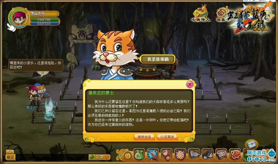 三.翻過重重山嶺終于來到貓家莊,找到長虹劍的主人虹貓,但別急虹貓會告訴你,只有作為拜師任務(wù)才可拜虹貓為師!
