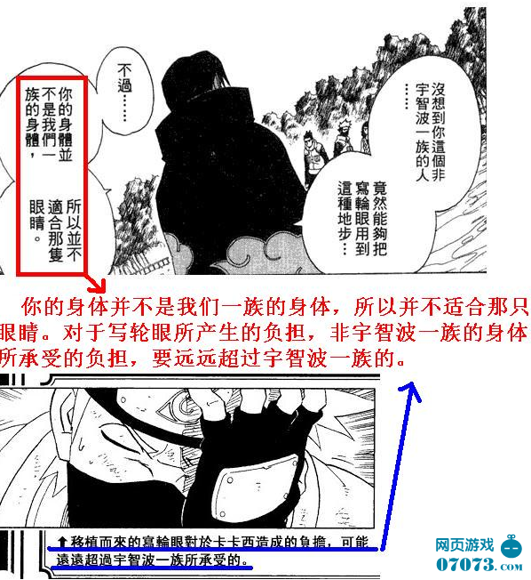鼬:你的身體并不是我們一族的身體,所以并不適合那只眼睛;言下之意就是適合寫輪眼的只有我們一族的身體。非宇智波一族的人使用寫輪眼都是有限制和極大的身體負(fù)擔(dān)的。