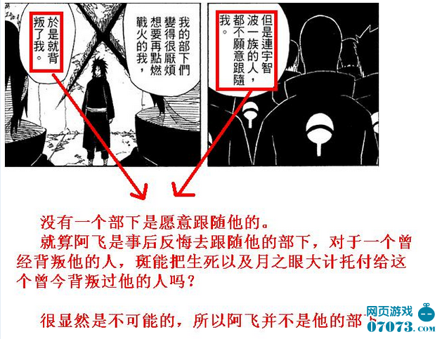 因?yàn)檠a(bǔ)充的第一個(gè)條件提到了阿飛的身體一定是宇智波一族的人的,那么阿飛會(huì)不會(huì)是斑忠心耿耿的部下呢?我的答案是,阿飛不會(huì)是斑的部下,這點(diǎn)漫畫中曾經(jīng)說過,斑的所有部下都背叛了他。