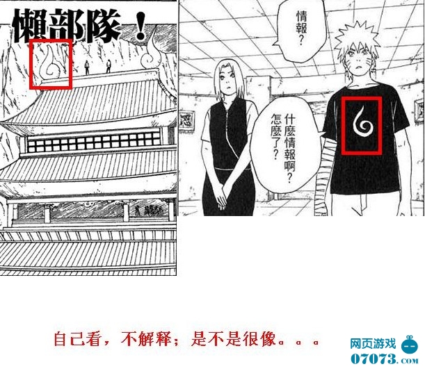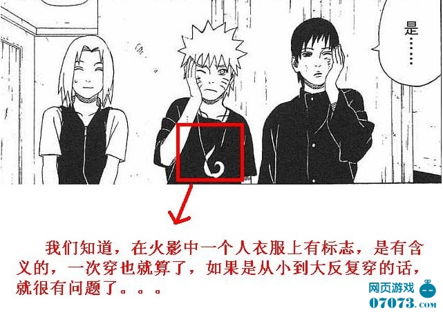 火影中的人物有這樣一個(gè)習(xí)慣,就是喜歡把自己家族的家徽弄在衣服上,比如小櫻,佐助和鳴人以及幾個(gè)木葉小強(qiáng),大強(qiáng)也是這樣的。