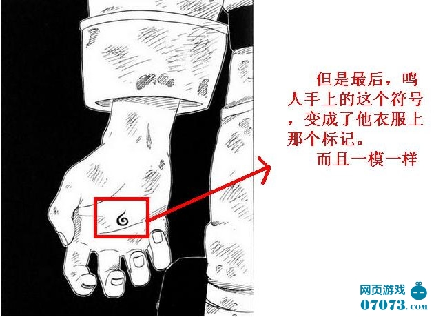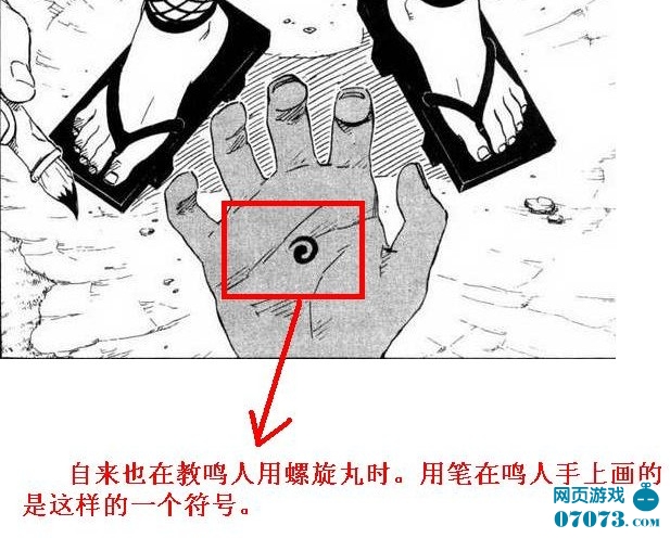 個(gè)人覺(jué)得這個(gè)標(biāo)志有種特殊的意義在里面,其實(shí)在第一部的時(shí)候,AB就在一個(gè)地方暗示了這個(gè)標(biāo)記非同尋常的意義,那就是在教導(dǎo)鳴人螺旋丸的時(shí)候,自來(lái)也為了讓鳴人能更好的集中查克拉,在鳴人的手心上畫(huà)了一個(gè)符號(hào)。