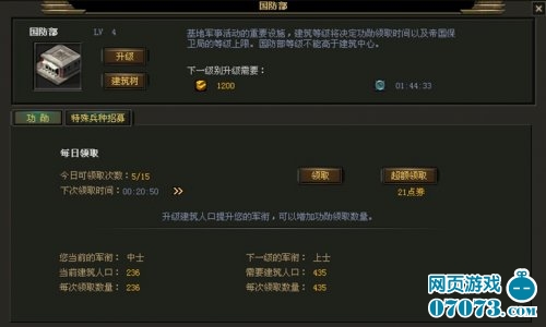 您的建筑人口越高,軍銜也就越高。這將直接決定您每天獲得功勛的量,以及可以使用的軍官數(shù)量。