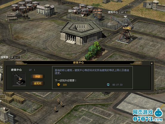2) 玩家可以點(diǎn)擊基地建筑圖標(biāo),在彈出的頁面中點(diǎn)擊升級(jí)按鈕升級(jí)基地建筑,基地建筑的發(fā)展基本依賴于建筑中心和建筑人口。建筑中心等級(jí)越高,基地其他建筑的等級(jí)就可以發(fā)展得越高。