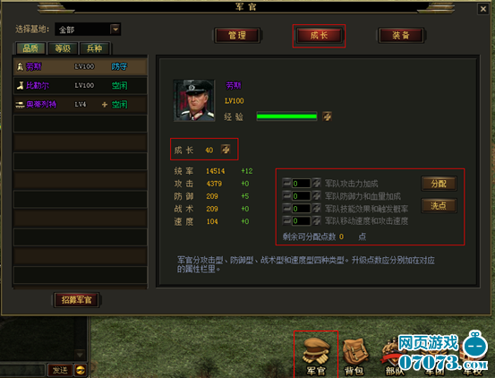 2) 成長點(diǎn)數(shù)部分是根據(jù)初始屬性比例自動分配的,還有一部分是由玩家進(jìn)行手動分配。玩家可以進(jìn)入軍官頁面的成長標(biāo)簽頁,使用手動分配成長點(diǎn),打造屬于自己的個(gè)性軍官。