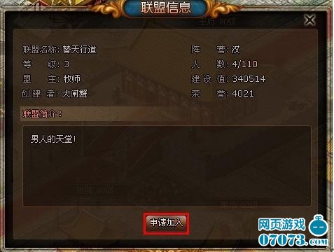 打開聯(lián)盟界面,可以看到自己陣營的聯(lián)盟列表,選擇想要加入的聯(lián)盟,點(diǎn)擊申請加入,待聯(lián)盟盟主通過后,即可加入該聯(lián)盟。