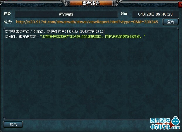 每次拜訪有幾率獲得道具【推舉信】,推舉信可以兌換10個進(jìn)貢單,【嘉獎令】——可兌換5個平叛勛章,【政績簿】——可兌換500政績。