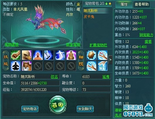 技能-- 寵物技能有4大類型,輔助(增強人物的主屬性),寶寶自身強化(增強寵物的主屬性),寵物單體攻擊(大大增加寵物攻擊輸出),群體攻擊(寵物的強力群攻技能)。技能分初級 中級 高級 頂-級 技能如果上一個臺階給的無論是寶寶自身屬性還是人物主屬性都很給力!所以大家選擇技能融合--現(xiàn)在推出了寵物融合,無非是加強了玩家PK之間的激烈程度(現(xiàn)在早優(yōu)化中),神技有12個,學(xué)滿1級2級3級4級,寵物技能自動為10級,很給力!