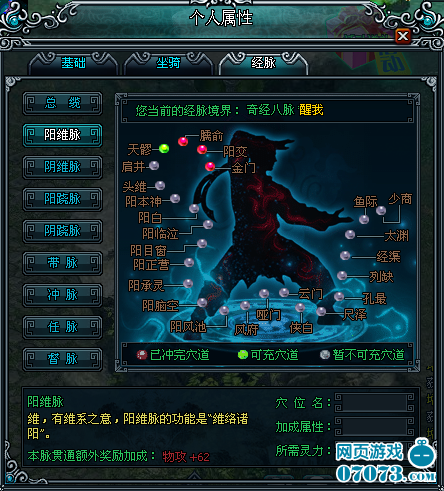 如當(dāng)陽(yáng)維脈的穴位全部打通之后,我們還將得到屬性點(diǎn)做為獎(jiǎng)勵(lì).