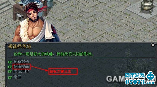 1、玩家在揚州城找到NPC鍛造師陳佑,鼠標(biāo)左鍵點擊對話窗口,點擊裝備提品按鈕,如下圖: