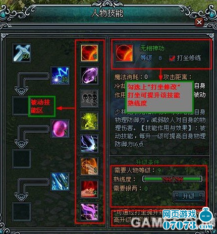 1、 各職業(yè)被動(dòng)技能的升級(jí)主要通過打坐來(lái)提升各被動(dòng)技能的熟練度,玩家需在技能面板上勾選上打坐需要修煉的技能,技能的等級(jí)越高,升級(jí)需要的熟練度越高,當(dāng)前級(jí)別的技能熟練度滿后,可進(jìn)行技能的升級(jí)。