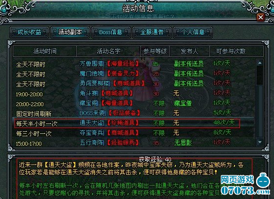 每半小時(shí)左右刷新一次,會(huì)在隨機(jī)幾張地圖內(nèi)刷出一批通天大盜,他們會(huì)在各地圖中四處游弋,只要您耐心的尋找,并將其擊殺,便可獲得通天大盜身藏的各種寶貝。