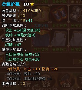 然后是裝備,40級(jí)的藍(lán)色墨陽是最基本的,升星到10,不要要求一定要靈轉(zhuǎn),有條件的可以嘗試。防具上40級(jí)的貪狼套裝可以給孫臏一套。裝備的屬性可以洗一洗,自然是以攻擊和統(tǒng)帥為主,防御也可以湊合。