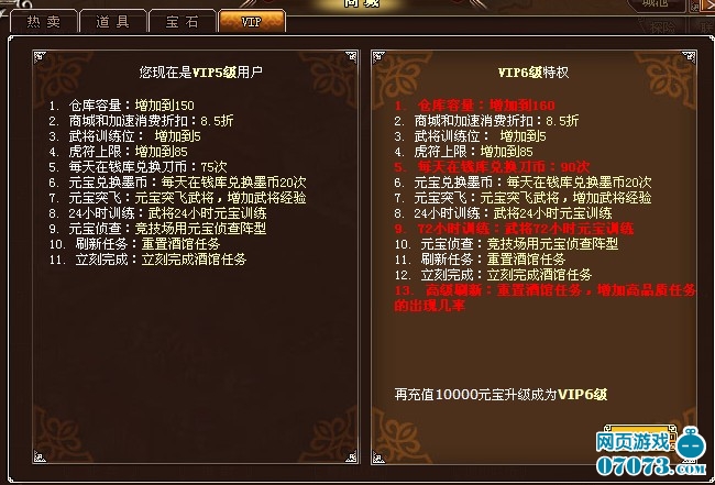 3.折扣。這一點對于經(jīng)常在消費的玩家來說應(yīng)該是有很深體會的,折扣也根據(jù)VIP等級提高而越多。如VIP5的折扣是8.5,VIP的折扣體現(xiàn)在很多方面,比如商城、秒各種CD,突飛武將等等。