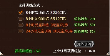 3.武將訓(xùn)練。有了禮券之后,可以選擇使用禮券進(jìn)行武將訓(xùn)練。禮券訓(xùn)練武將的方式有兩種:8小時(shí)訓(xùn)練消耗3禮券,經(jīng)驗(yàn)增加50%;24消耗訓(xùn)練消耗10禮券,經(jīng)驗(yàn)增加50%。