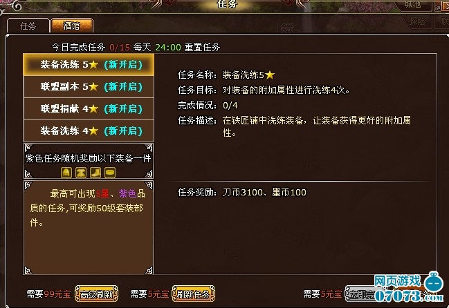 這里還要給大家說一點(diǎn)我遇到的情況。有一次我用99元寶刷酒館,基本上刷一次就會(huì)有一個(gè)紫色的任務(wù)出現(xiàn),但是任務(wù)獎(jiǎng)勵(lì)全都是護(hù)甲。大家都知道這里刷出的護(hù)甲是不能交易的,因此太多根本就沒用。所以這里要告訴各位,如果你也遇到這樣的情況,建議你可以用5元寶刷新一次,這樣你就可以將獎(jiǎng)勵(lì)變成套裝的其他部件。