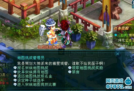 宗族的族長(zhǎng)可以在摘星城的NPC-地圖管理官員處,對(duì)一處不屬于自己宗族的場(chǎng)景地圖進(jìn)行挑戰(zhàn)報(bào)名。