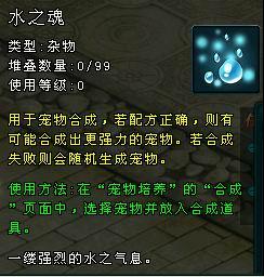 30級以上的寶寶寵物和一個五行之魂可以進(jìn)行合成,合成將會根據(jù)寵物和五行屬性產(chǎn)生新的寵物或是原有寵物的變異品種,在搭配正確的情況下將有可能出現(xiàn)實力強(qiáng)大的隱藏寵物。合成寵物是獲得隱藏寵物的唯一途徑。